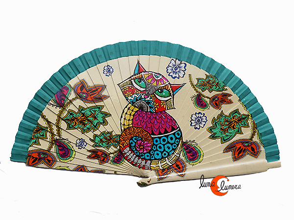 Abanico de tela y madera pintada con gatos, gato Gaudí.