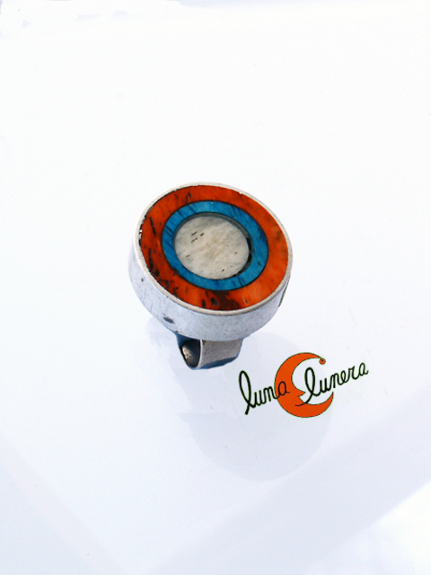 Anillo ajustable. Hecho con base de aluminio y resinas. Tamaño: diámetro 2,5 cm. altura 0,5 cm. Color naranjo con círculos concétricos blanco y azul.