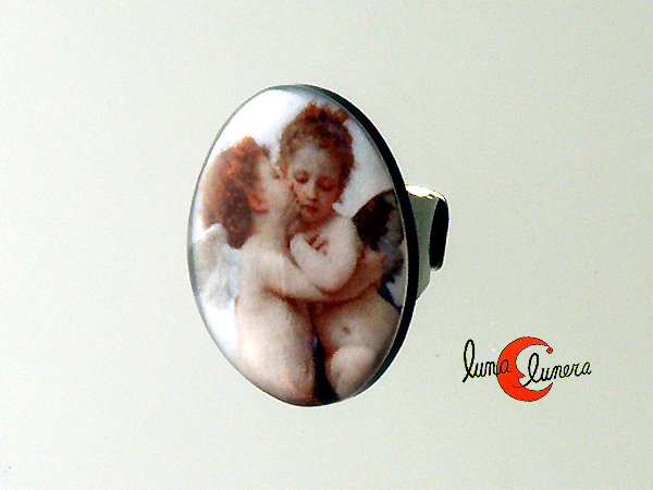 Anillo de resina y bisutería ajustable, con imagen de dos angelitos de Rafael, predominan los tonos claros.