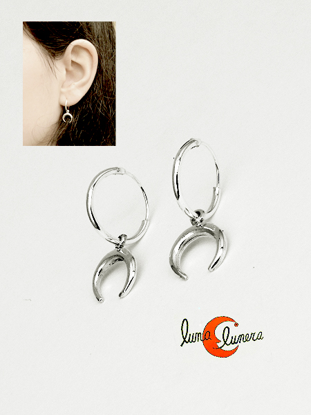 Aros pequeños de plata con adorno colgando. Luna invertida.