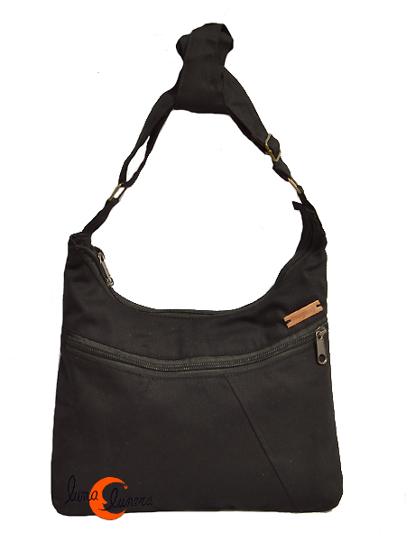 Bolso negro de bandolera de algodón. Tamaño aproximado: 20 cm de alto por 26 cm de ancho, tiene una base de 2 cm. Cierra por arriba con cremallera redondeada. Además, tiene dos bolsillos grandes exteriores, también con cremallera, uno por la parte delantera y otro de seguridad por detrás . Es muy cómodo y no pesa.