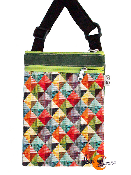 Bolsito de tela con cremallera para llevar el teléfono móvil. Tiene el asa larga, por lo que se puede llevar tanto colgado al cuello, o como si fuera una pequeña bandolera. Cierra con cremallera. Por delante tiene un pequeño bolsillo para usar como monedero también con cremallera y por detrás otro bolsillo más profundo y abierto, para llevar gafas o las llaves. Es un producto de artesanía hecho por la casa Brúo, garantía de una estupenda calidad, fabricado en tela Jacquard muy duradera, lavable y resistente, fabricado por artesanos íntegramente en España, tanto la confección como las telas.