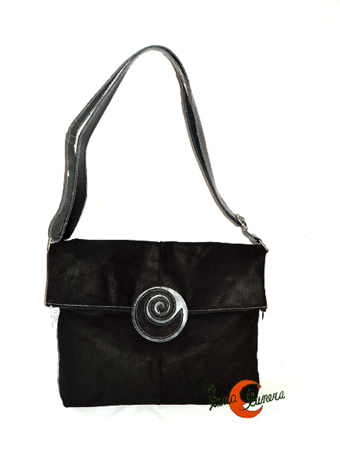 Bolso estilo urbano de piel negra texturizada muy blandita, cierra con cremallera. La solapa se dobla y sujeta con velcro que está por debajo de un adorno, también de piel negra, con forma de espiral. El asa es larga para poner en bandolera, pero se puede acortar para llevar el bolso en el hombro. Por dentro está forrado y tiene un bolsillo abierto para llevar algunascosas siempre a mano.