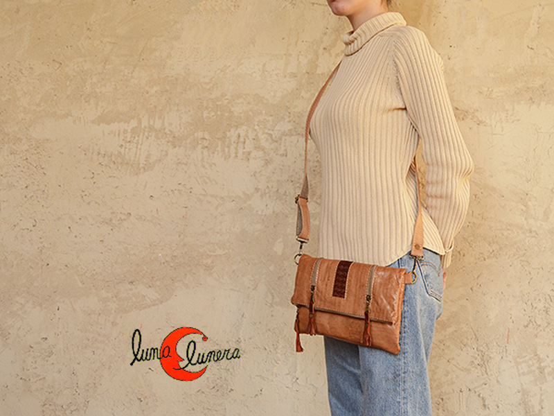 Bolso de mano de cuero marroquí rectangular con cremalleras, color natural.