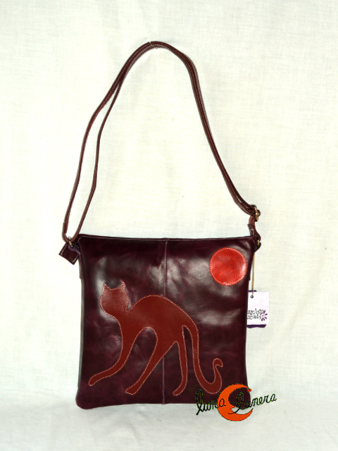 Arteycuero, bolsos de piel plano grande, burdeos con gato y luna llena.