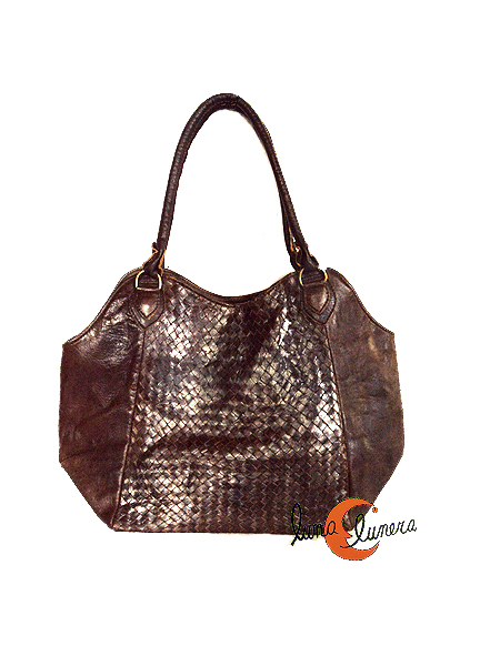 Precioso bolso marrón oscuro y grande de piel marroquí tipo shopping de dos asas y piel trenzada. Cierra con cremallera, está forrado y tiene un pequeño bolsillo interior que cierra también con cremallera.