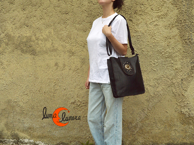 Bolso de cuero marroquí bandolera grande rectangular con solapa y adornos de metal. Negra.