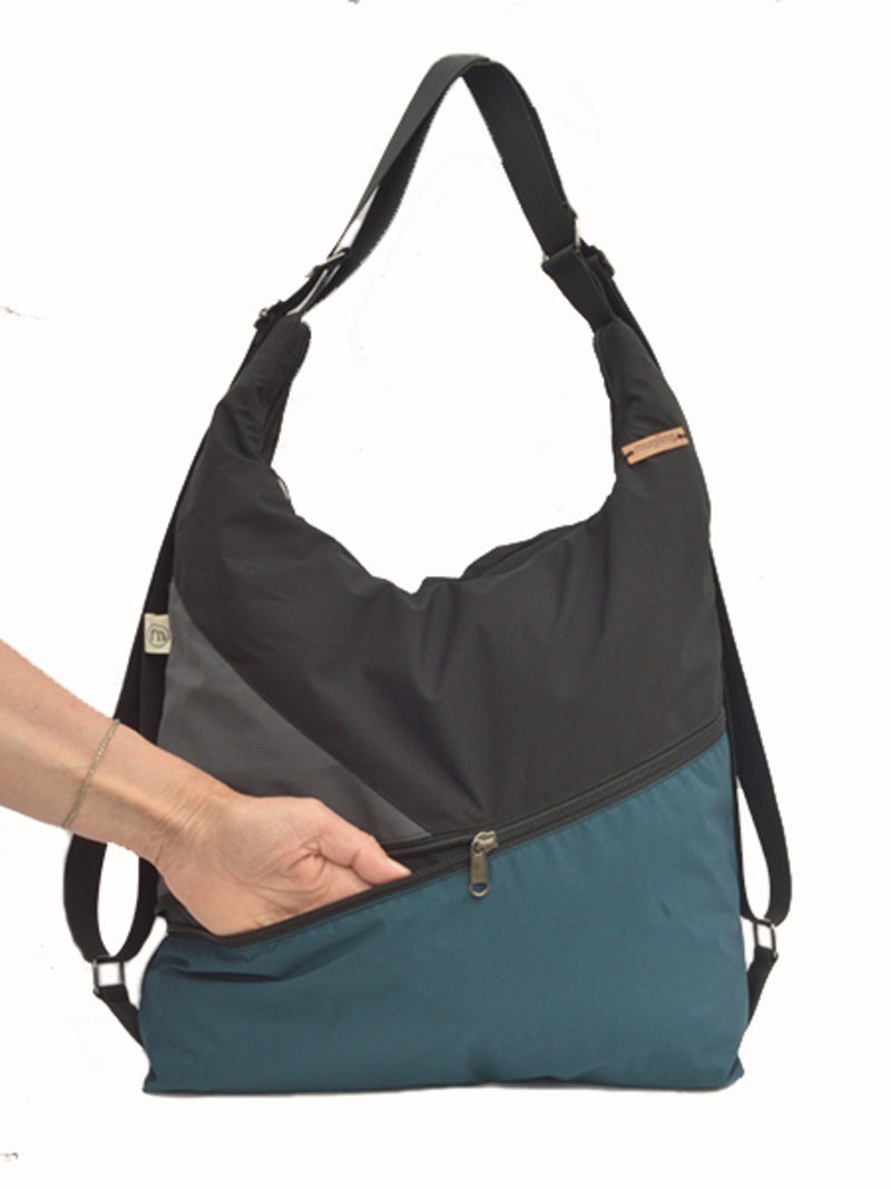 Bolso grande convertible en mochila de tela impermeable. El compartimento principal es muy amplio y cierra con cremallera (tiene un pequeño bolsillo interior). Por delante tiene un bolsillo grande y otro más pequeño lateral,y por detrás, también tiene un bolsillo grande antirrobo, todos con cremallera. Este bolsos puede usarse como bolso de hombro, o ajustando los tirantes, también puede usarse como mochila. ES de tela muy ligera e impermeable, no pesa nada. Tiene mucha capacidad para llevar cosas bien separadas en sus dos bolsillos grandes: el delantero y el de atrás.