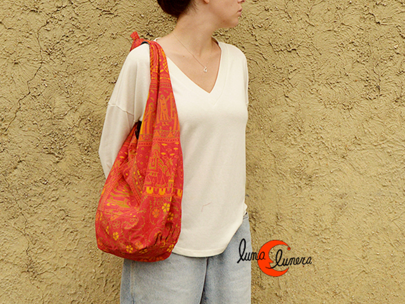 Bolso grande tipo saco de tela de algodón estampado con asa ancha, cierra con botón y no tiene cremallera. Es REVERSIBLE, se puede usar por el lado de tonos cálidos rojos y naranjas, o bien, por el lado de los tonos fríos, azules y verdes.Por ambos lados tiene un bolsillo exterior sin cremallera. El asa es ancha y larga, lo que permite distribuir el peso, aunque es muy ligero y liviano, y además permite dos formas de uso: como bandolera o haciendo un nudo en el asa, como bolso corto de hombro. Tiene mucha capacidad.