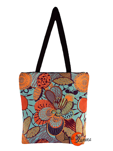 Bolso del taller artesanal Bruo. Bolso tipo shoping grande de tela con doble asa y cierre con cremallera. Tanto las telas como las asas son de algodón y de primera calidad, al igual que su diseño y cuidadas terminaciones. Por dentro está forrado y tiene dos bolsillos sin cremallera, para tener siempre a mano las llaves, un monedero o el teléfono. Es un bolso grande donde caben muchas cosas: para el ordenador, la merienda, muda de ropa o para la playa. Es muy ligero, cómodo y no pesa. Un bolso multiusos que sin duda, te durará mucho tiempo.