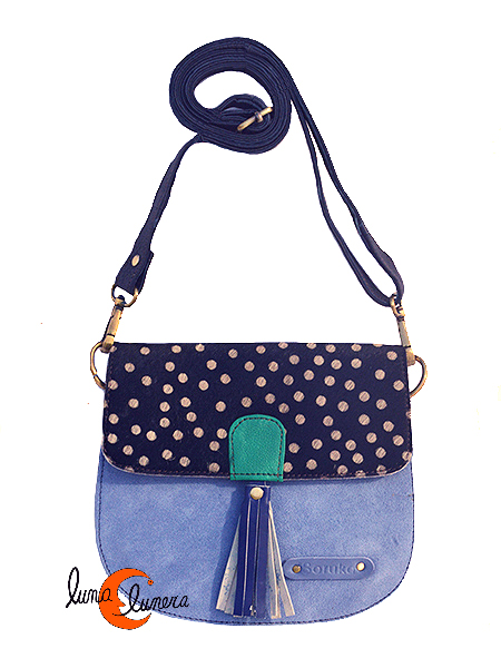 Bolso pequeño de bandolera de piel de colores de la casa catalana Soruka fabricado en India con pieles recicladas. Producto de artesanía hecho con buenos acabados y buenos materiales, garantía de calidad. Piel de ante, cierra con solapa con cierre de imán. Tiene un pompón con flecos de piel como tirador. Por dentro, tiene tres compartimentos independientes uno de ellos con un bolsillo interior con cremallera, pese a ser pequeño, tiene bastante capacidad pues tiene una base amplia de hasta 9 cm. Está forrado con tela, tiene una asa para usarlo como bandolera y que se puede sacar. Súper cómodo, liviano y muy bonito por su especial combinación de colores.