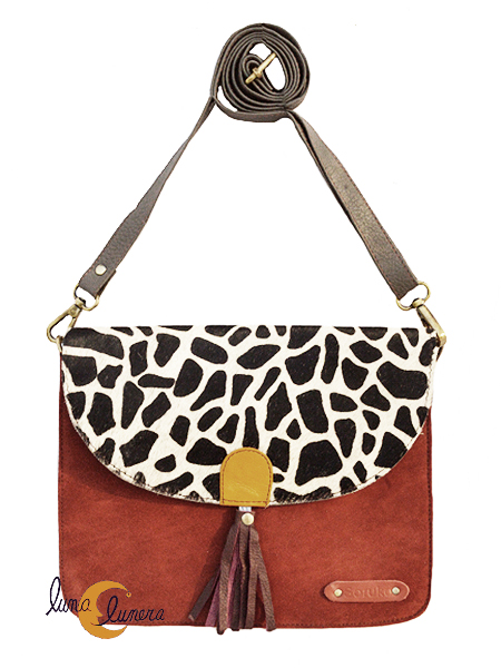 Soruka, bolsos de piel de colores. Bolso grande cuadrado de ante y print, marrón.