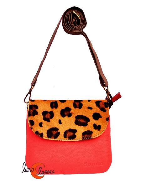 Soruka, bolsos de piel de colores. Bolso pequeño plano con solapa, coral y print.