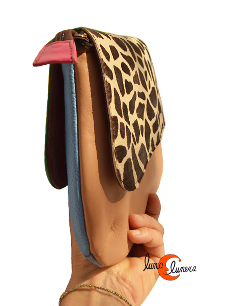 Este bolso tiene la tapa intercambiable por lo que tiene cuatro combinaciones posibles para cobinar los colores, tanto en liso comoen print. La tapa cierra con dos broches de imán. Cierra con cremallera debajo de la solapa. Por dentro, tiene un solo compartimento y un pequeño bolsillo interior con cremallera. Está forrado con tela, tiene una asa para usarlo como bandolera y que se puede sacar para usarlo también como bolso de mano. Súper cómodo, liviano y muy bonito por su especial combinación de colores.