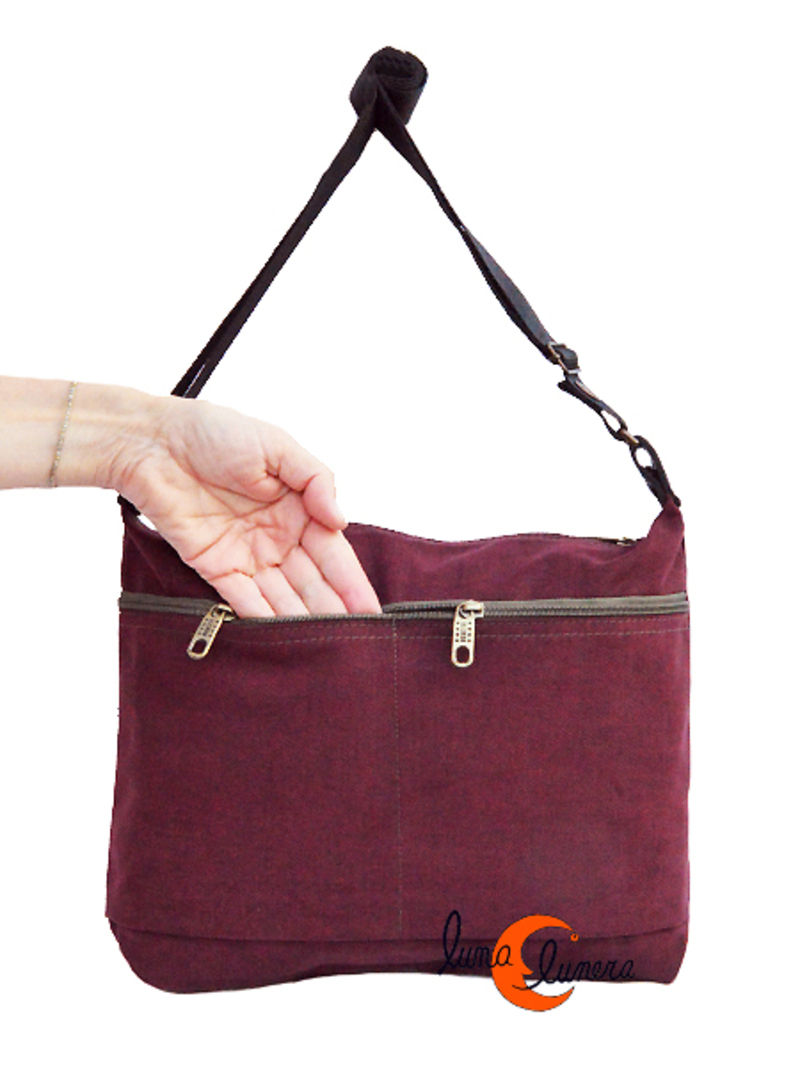 Bolso bandolera pequeño que cierra con cremallera. Por delande tiene dos bolsillos grandes independientes que cierran también con una única cremallera. En el interior no tiene separaciones, es un único espacio grande con gran capacidad. Asa regulable. Lavable en la lavadora.