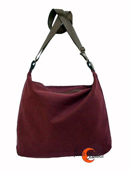Bolso bandolera grande tipo morral liso que cierra con cremallera. Es muy sencillo, tipo un saco de bandolera rectangular liso, sin bolsillos y que cierra con cremallera. Por dentro tiene un pequeño bolsillo abierto para llevar a mano el monedero, las llaves o el móvil.En el interior no tiene separaciones, es un único muy grande con gran capacidad. Asa regulable. Lavable en la lavadora.