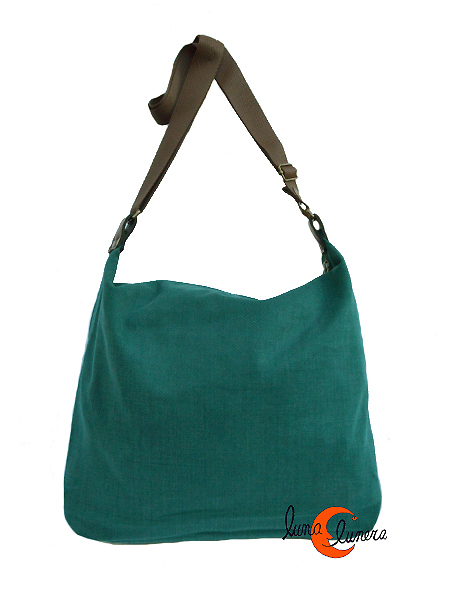 Bolso bandolera grande tipo morral liso que cierra con cremallera. Es muy sencillo, tipo un saco de bandolera rectangular liso, sin bolsillos y que cierra con cremallera. Por dentro tiene un pequeño bolsillo abierto para llevar a mano el monedero, las llaves o el móvil.En el interior no tiene separaciones, es un único muy grande con gran capacidad. Asa regulable. Lavable en la lavadora.