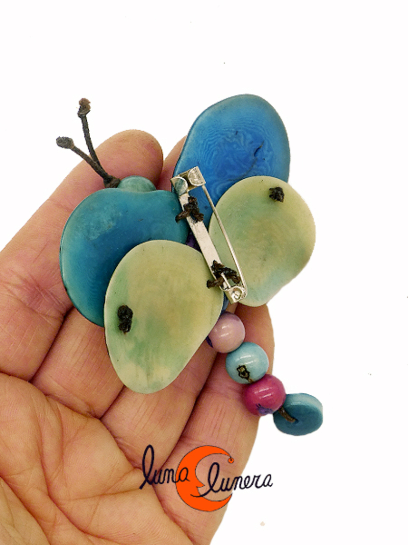 Broche con forma de mariposa hecho con semillas de tagua. Son broches grande, livianos, coloridos, muy vistosos, originales y divertidos. Las semillas mantienen siempre el color y el brillo.