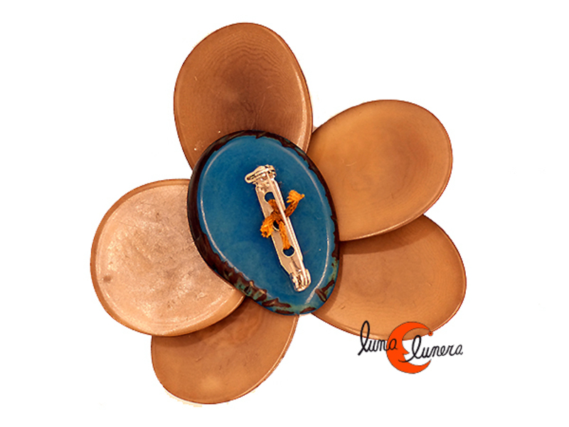 Broche con forma flor hecho con semillas de tagua. Son broches grandes, livianos, coloridos, muy vistosos, originales y divertidos. Las semillas mantienen siempre el color y el brillo.