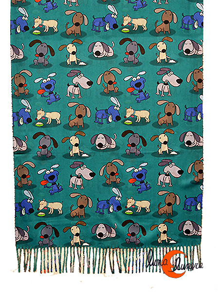 Precioso fular/bufanda con dibujos de perros, calentito para el invierno, de tacto muy suave que recuerda al cachemir. Composición: 20% viscosa y 80% lana. Ideal para el invierno, puede anudarse en el cuello sin abultar. Muy cómodo, no pica.