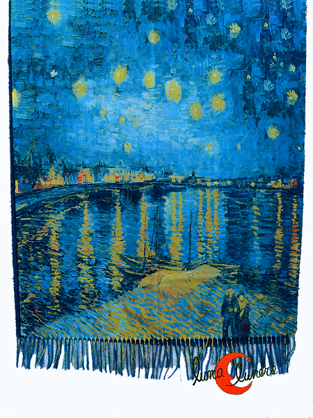 Precioso fular/bufanda con flecos calentito para el invierno muy suave al tacto,con el cuadro La Noche estrellada de Vang Gogh. Composición: 30% cachemir y 70 % viscosa.
