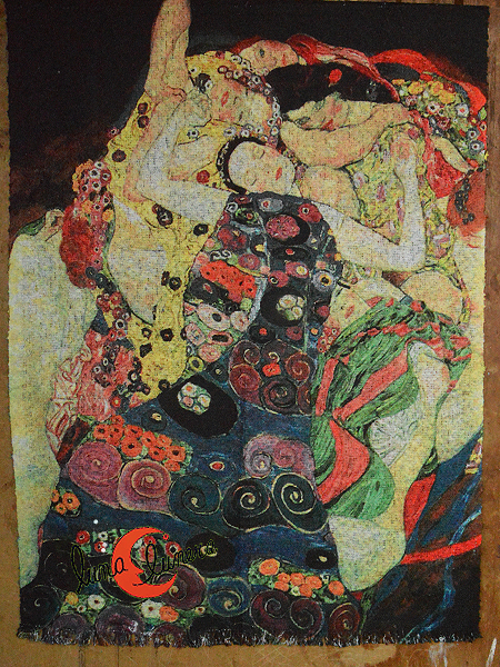Precioso fular/bufanda con flecos calentito para el invierno de lino rústico muy suave al tacto,con el cuadro La Virgen de Klimt. Composición: 20 % lana, 10% algodón y 70 % viscosa. Reversible, por detrás tiene flores en tonos lilas, lilas y anaranjados pastel. Es precioso.
