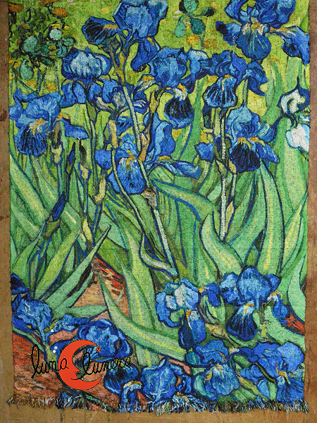 Precioso fular/bufanda con flecos calentito para el invierno de lino rústico muy suave al tacto,con los lirios de Vang Gogh. Composición: 20 % lana, 10% algodón y 70 % viscosa. Reversible, por detrás tiene flores en tonos lilas, lilas y anaranjados pastel. Es precioso.