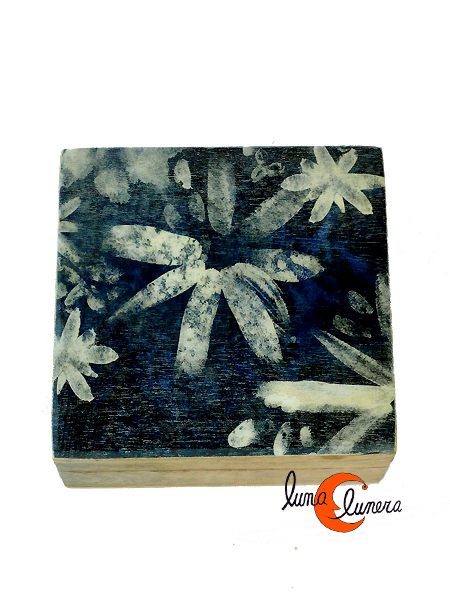 Caja de madera cuya tapa está decorada con dibujos de hojas en tonos azules.