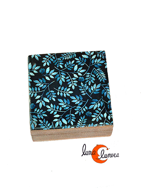Caja de madera pequeña, azul hojitas.