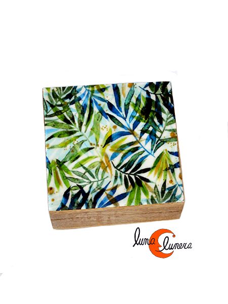 Caja de madera cuadrada cuya tapa está decorada con dibujos de hojas en tonos verdes.