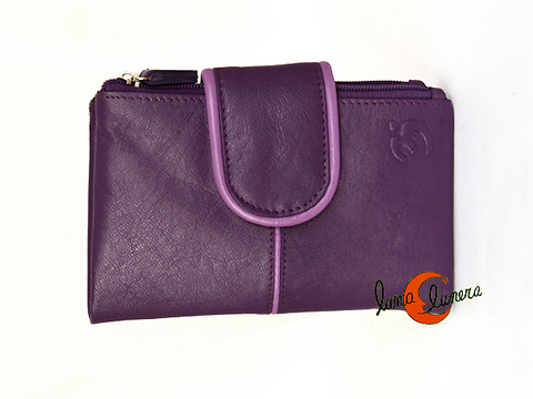 Carteras de piel Belmonte. Cartera grande de vivos colores con espacio para diez tarjetas más foto y DNI, cierre con trebilla y dos monederos externos con cremallera. Separador de billetes y bolsillos interiores. 14,50 por 9,50 cm.
