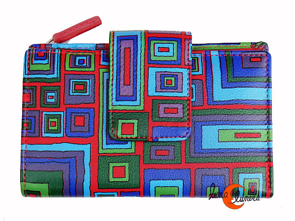 Cartera rectangular de piel blanda de colores de la casa Belmonte. Es de tamaño pequeño pero tiene mucho servicio (9 por 13 cm.), tiene sitio para 10 tarjetas, pero pueden caber más de una por espacio. Debajo de las tarjetas y a ambos lados tiene otro espacio interior para guardar tikets o papeles. Tiene doble billetero superior y dos monederos grandes con cremallera. Cierra con trabilla con cierre de click. De piel muy suave al tacto.