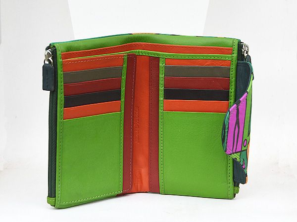 Carteras de piel Belmonte. Cartera grande de vivos colores con espacio para diez tarjetas más foto y DNI, cierre con trebilla y dos monederos externos con cremallera. Separador de billetes y bolsillos interiores. 15 por 10 cm.