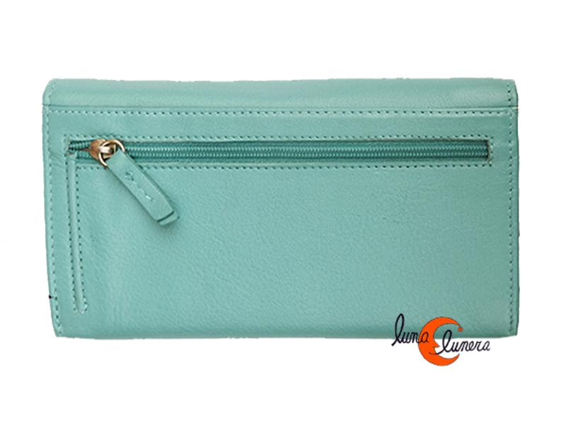 Carteras de piel de colores Belmonte, colección Jardín Japonés. Cartera tipo monedero grande que cierra con solapa con cierre de clip. En el interior tiene espacio para ocho tarjetas y uno con ventana para el DNI. Tiene dos compartimentos individuales separados por un pequeño monedero interior con cremallera. También en el interior, por la parte delantera tiene otro espacio independiente con un segundo monedero pequeño con cremallera. Es un diseño muy original, cómodo y práctico: lo llevas todo a mano, a la vista y ordenado.