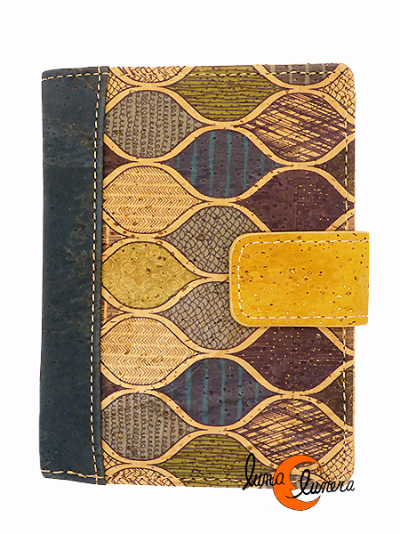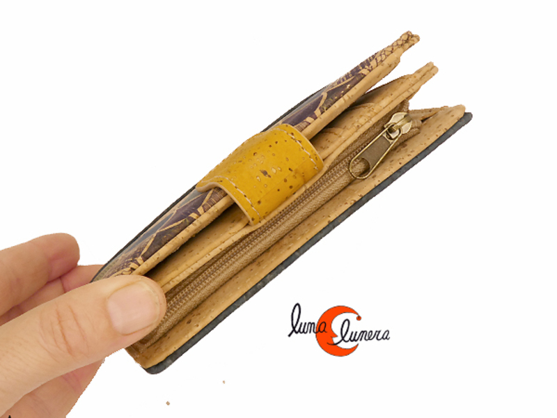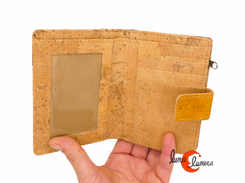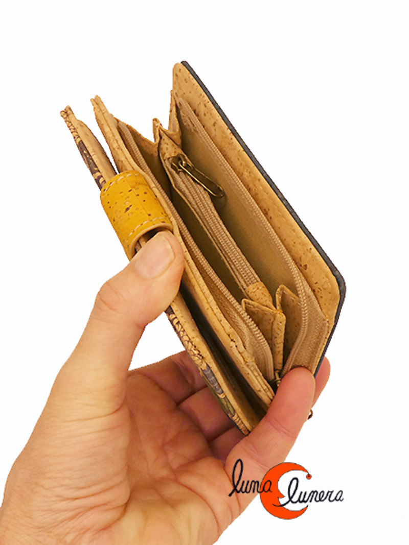 Cartera pequeña con criterios veganos hechas de corcho y tela. Tiene monedero por fuera con cremallera. La cartera se sujeta con una trabilla con cierre de clip. Tiene tres amplios espacios para tarjetas (donde caben más de una tarjeta) más uno para foto o DNI. Tiene también dos compartimentos interiores debajo de las tarjetas, más un espacio abierto por la parte superior para guardar billetes. Son muy livianas, bonitas y de calidad.