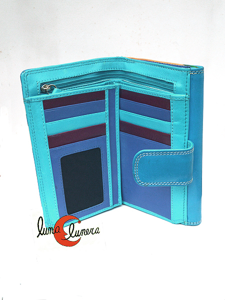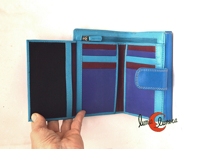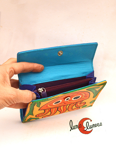 Carteras de piel Belmonte. Cartera grande pintada a mano con peces de vivos colores. Muy completa por dentro, con espacio específico para 16 tarjetas y dos para fotos o DNI. Tiene tres compartmentos interiores bajo las tarjetas. Por la parte trasera, tiene un monedero doble exterior con cremallera y muelles, de gran capacidad. Son diferentes los dibujos de delante y detrás.