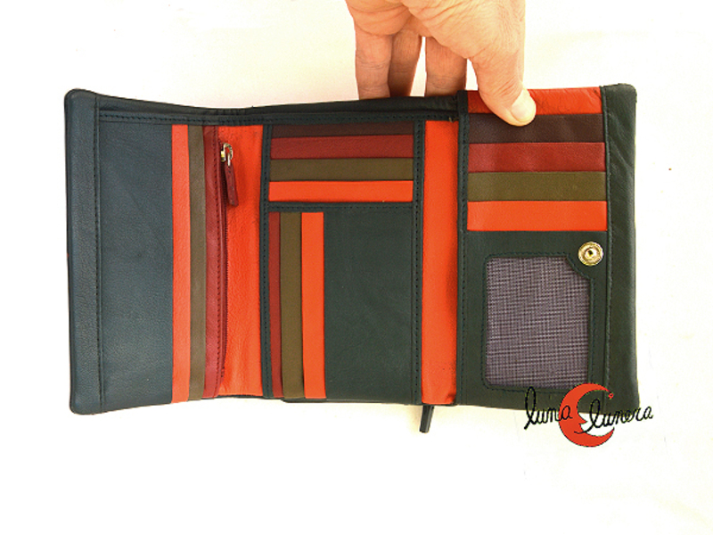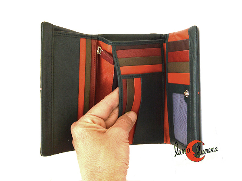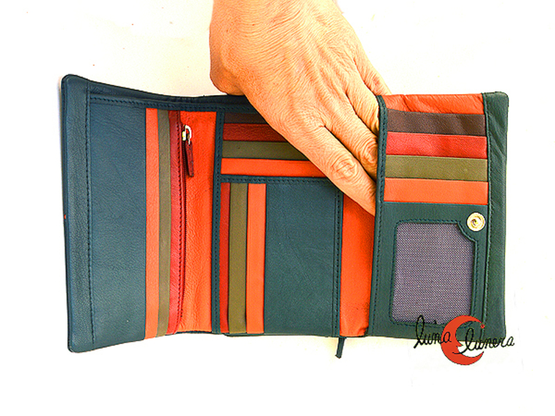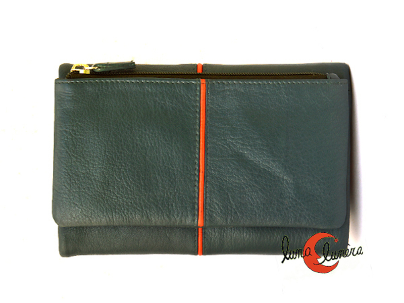 Carteras de piel Belmonte. Cartera mediana de color liso por fuera, con muchos colores en el interior. Con espacio para once tarjetas y DNI. Tiene apertura por delante, donde quedan a la vista las tarjetas y el DNI, un monedero interior con cremallera, separador de billetes y espacios interiores bajo las tarjetas. Por la parte trasera, tiene un monedero grande que cierra con cremallera, titalmente independiente de lacartera. Su piel es muy suave y la marca Belmonte, garantía de calidad.Es un modelo de tamaño mediano con gran capacidad.