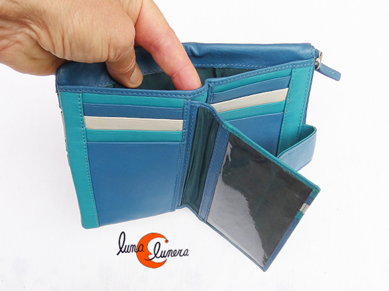 Carteras de piel Belmonte. Cartera mediana de color liso con sutiles apliques de colores que recuerdan  las líneas de un jardín japonés. Con billetero y espacio específico para 12 tarjetas (aunque caben más) y otros tres para fotos o DNI. Tiene dos compartimentos interiores bajo las tarjetas y tiene además como particularidad que uno de sus tarjeteros es extraíble. Por fuera tiene un monedero exterior muy espacioso con cremallera y cierra con trabilla con broche a presión. Su piel es muy suave y la marca Belmonte, garantía de calidad. Es un modelo mediano y con mucho servicio. Súper práctico, ideal para bolsos pequeños.