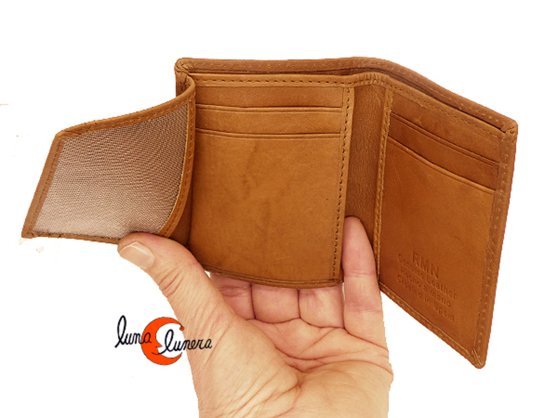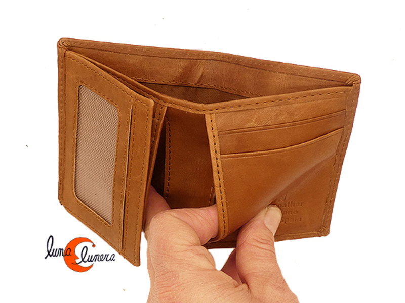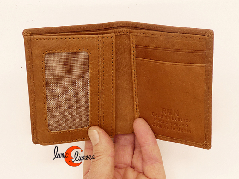 Pequeña cartera con billetera y tarjetero de piel para chico o chica. Tiene cuatro espacios específicos para tarjetas y dos con ventana para fotografía o DNI. Con separador de billetes por arriba y otros dos espacios debajo de las tarjetas. Sólo para billetes, documentación y tarjetas.
