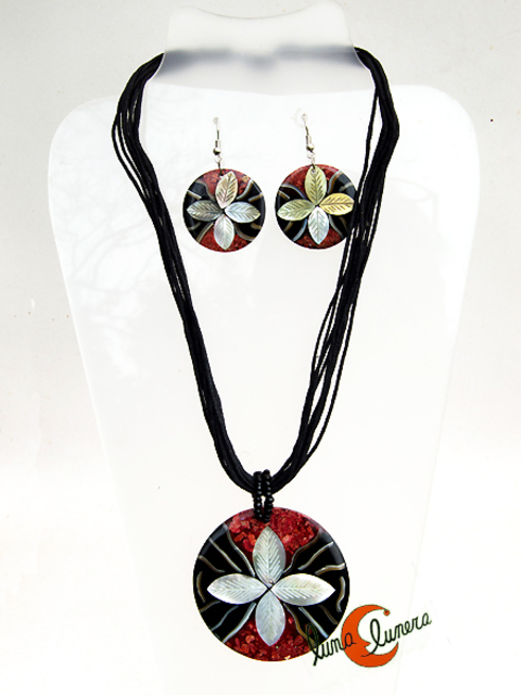 Conjunto de gargantilla y pendientes de resina con un colgante redondo con una flor de nácar en el centro de cuatro pétalos y fondo negro y rojo. Tamaño: diámetro del colgante 6 cm. diámetro de los pendientes: 3 cm. Hilo de algodón de 45 cm de largo aproximadamente. No pesa nada.