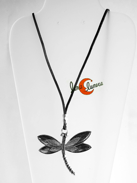 Collar con colgante de una libélula de metal plateado. Tiene cordón de cuero que se puede ajustar a distintas alturas, siendo el máximo de  80 cm., es decir, 40 cm doblado. Tamaño del colgante 6 por 6,5 cm.