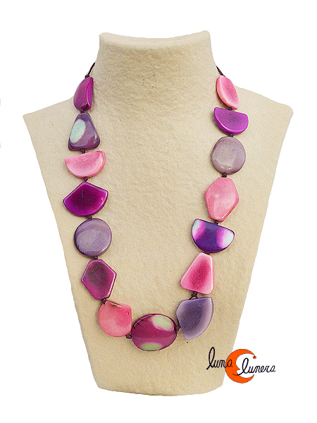 Collar hecho con semillas de tagua. Está hecho con piezas de semilla hiladas con cordel y al final tiene un sistema de nudos que permite ponerlo a diferentes alturas: desde un collar largo hasta uno de largo medio. Es muy vistoso, muy original y muy alegre. Bisuteria orgánica donde las semillas mantienen siempre el color y el brillo.