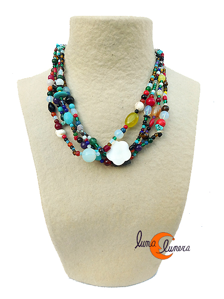 Collar corto tipo gargantilla de cuatro vueltas multicolor hecho con piedras, cristal y nácar. Con cierre de metal por detrás.