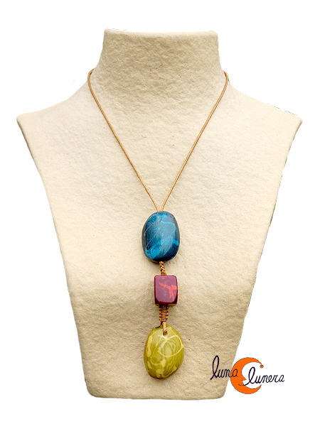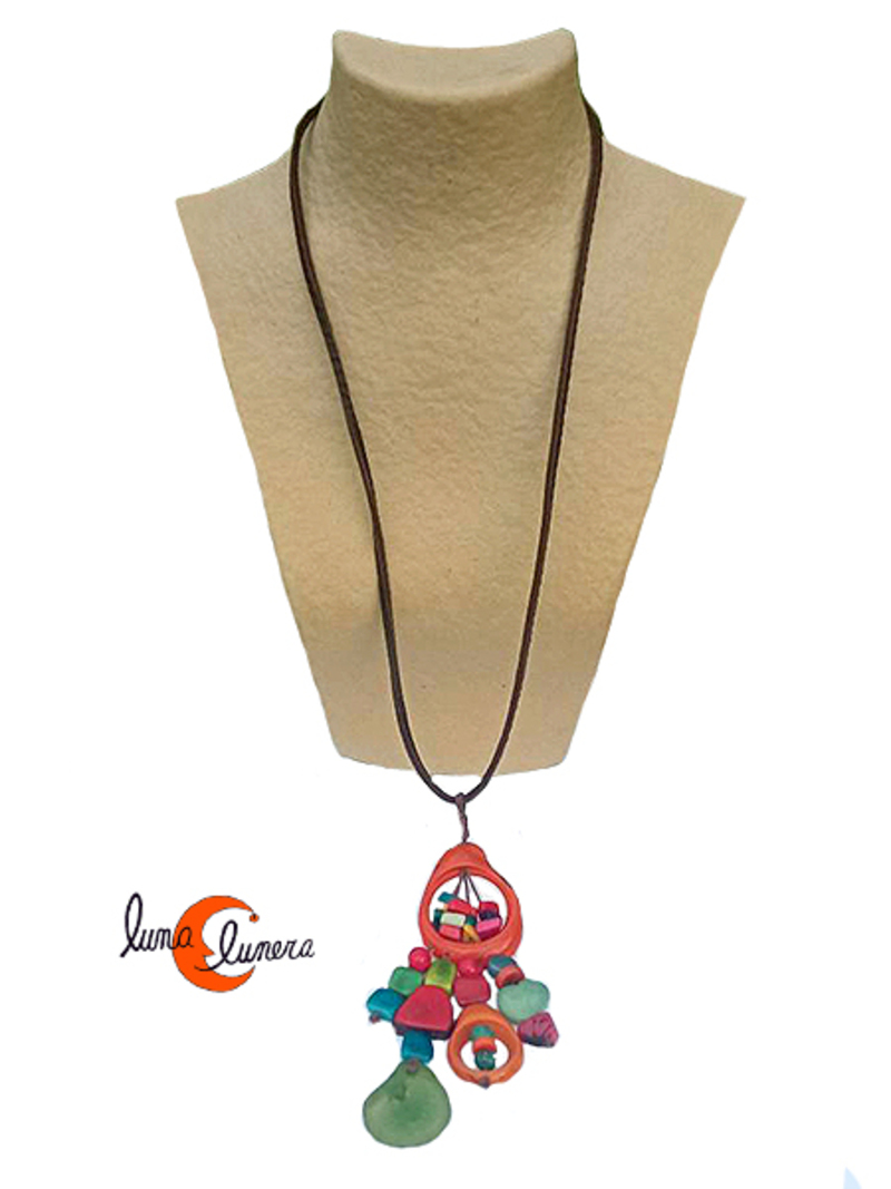 Collar tipo colgante con cordón hecho con semillas de tagua. Está hecho con piezas de semilla hiladas con cordel, en la parte de atrás tiene un sistema de bolitas que permite ponerlo con facilidad y regular su altura. Lleva cordón de cuero y puede usarse como un collar largo o corto, es muy ligero, vistoso, original y alegre. Bisuteria orgánica donde las semillas mantienen siempre el color y el brillo.