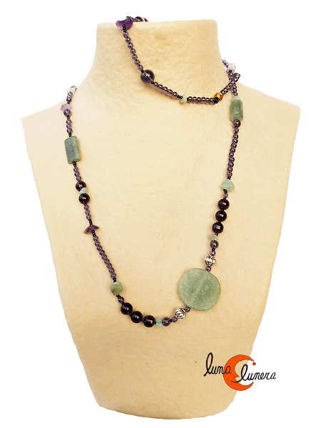 Collar largo, sin cierre. Tiene piedras de jaspe verde y las bolitas son de cristal color morado.