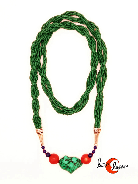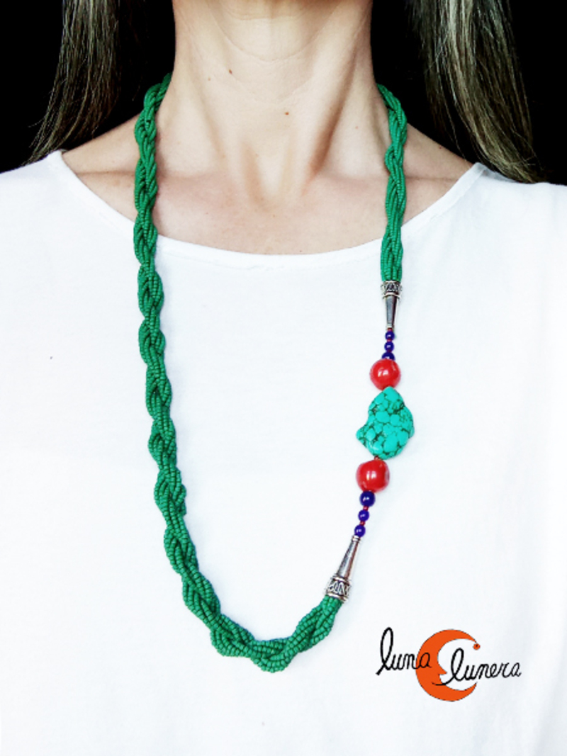 Collares India. Collar de piedras naturales de varias vueltas trenzadas, verde con turquesa y coral.