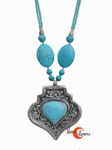 Collares India. Collar de piedras naturales con medallón turquesas y bolitas.