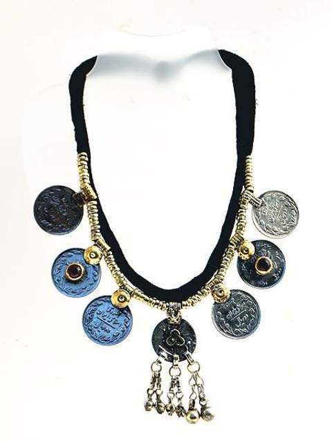 Precioso collar tradicional de India, de alpaca y bronce, con siete monedas de Paquistán colgando de un cordón de algodón de color negro. La del medio, está adornada con flecos e incrustraciones de cristales verdes. También tiene dos incrustraciones de cristales rojos en dos monedas laterales. Diámetro de las monedas 2,8 cm. Largo de la pieza central incluídos los flecos 5 cm. Largo del cordón 38 cm.
