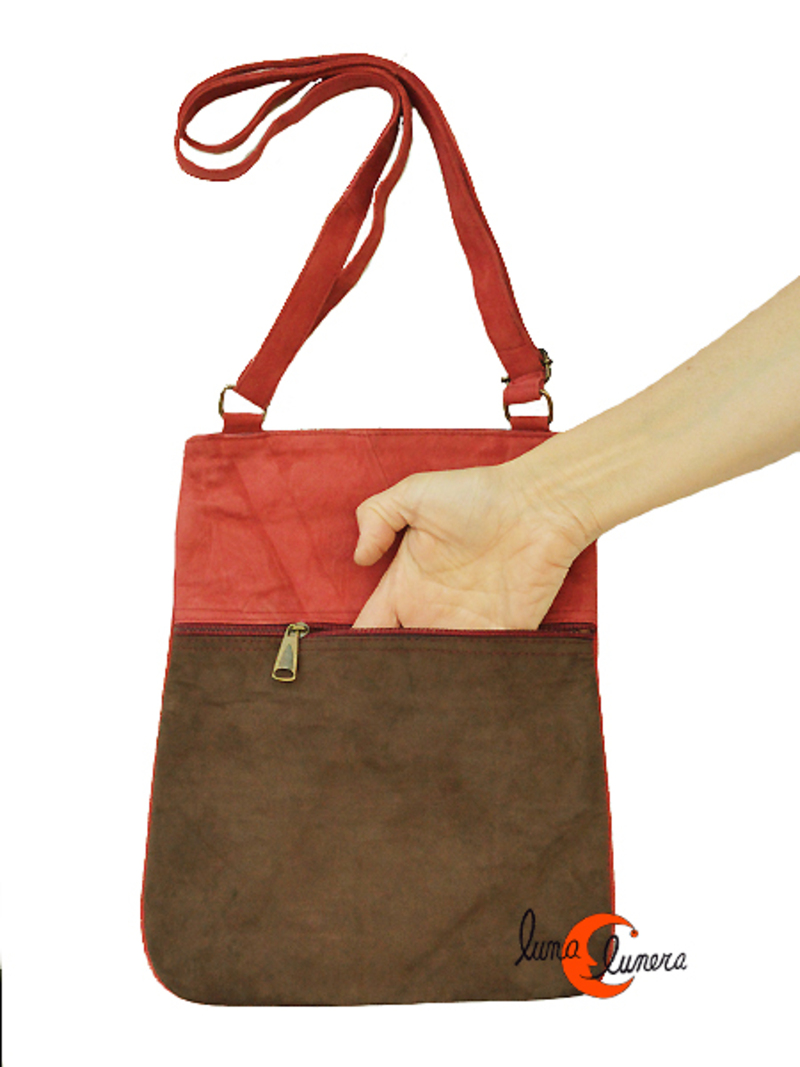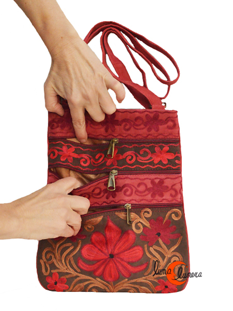 Bolso plano de bandolera grande de piel de ante bordado. Es un producto de artesanía tradicional de India. De piel blanda e interior forrado con tela. Es un bolso con bastante capacidad, muy cómodo y liviano. Tiene el asa regulable.