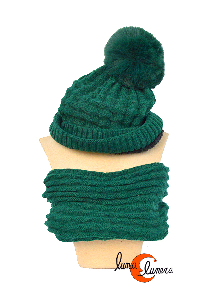 Conjunto de gorros con pompom y cuello a juego. Son de material acrílico, pero imitan la lana. Son muy, muy suaves tanto por fuera como por dentro. En su interior están forrados con peluche que aporta calor y suavidad. El pompom que llevan encima también es muy suave y amoroso. El cuello (bufanda) es cortito estilo braga.